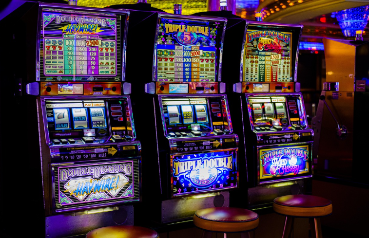ALT: Photo of three slot machines with colorful displays and illuminated graphics in a casino setting